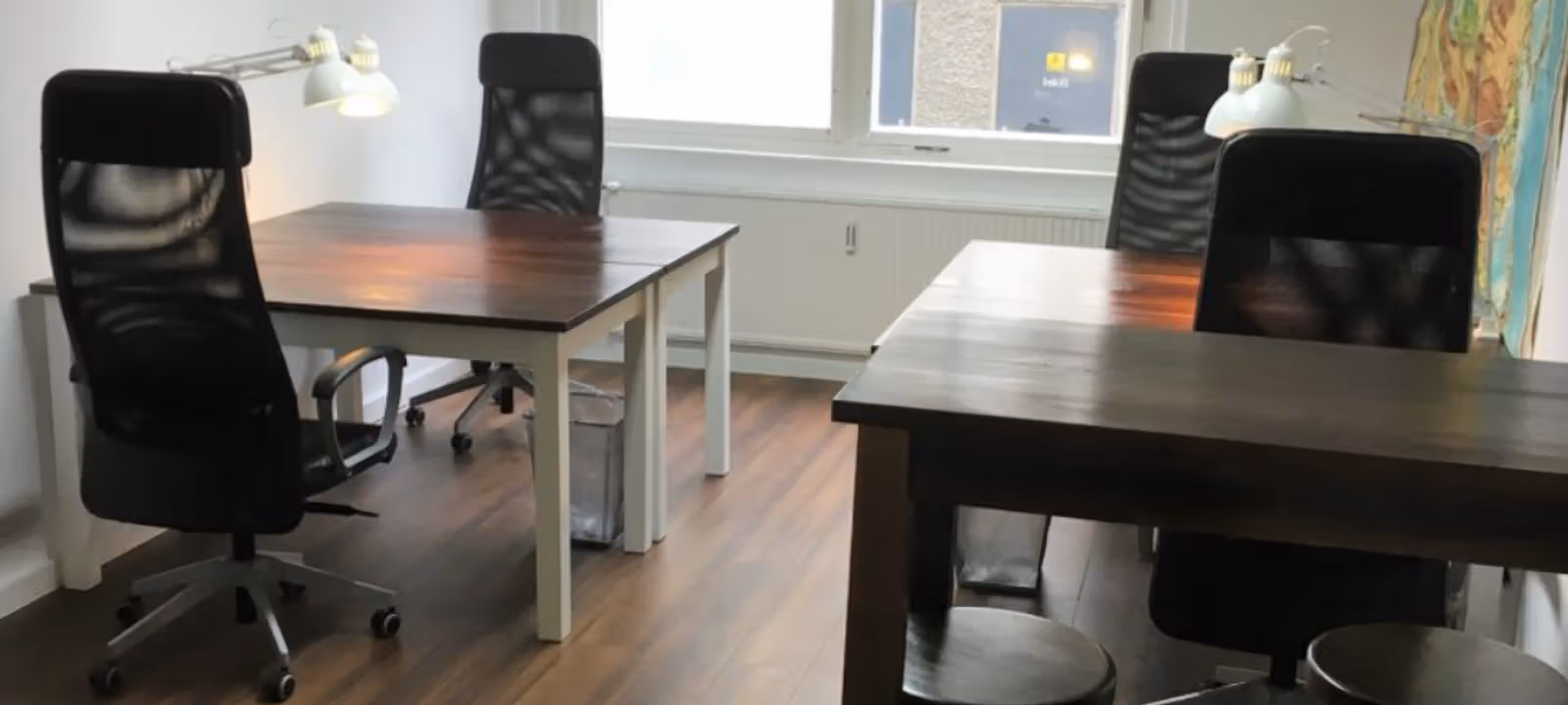 With us, you don't have to be super cool, a designer, a prodigy, you don't need a great startup story or investors. Here at our neighborhood office, you can simply be a freelancer, founder, small business owner, artist, or self-employed professional. We're all about offering you a flexible workspace or office space at an affordable rent, where you can work in peace or in a group. It's an alternative to working from home, a place where you can work in a relaxed and distraction-free environment. That's why we offer a comfortable atmosphere rather than designer lounges, team offices rather than executive suites, sturdy desks rather than high-tech equipment, and shared offices rather than a factory-style design.This coworking spaces can be found at several very central locations in Berlin and Hamburg. We offer fixed or flexible individual workstations, team offices, and meeting rooms.Things are a bit more relaxed, simpler, and less hectic here. Just like in the neighborhood. The clientele is diverse; people know each other, greet each other, and respect one another. Anyone who wants to can meet up for lunch or a chat in the kitchen, or participate in our various events.